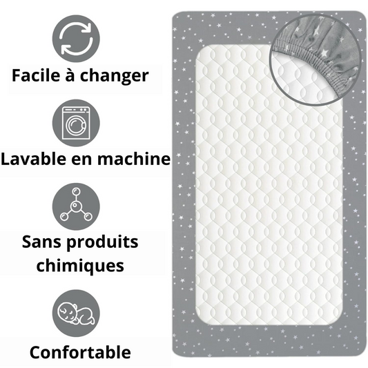 Pas envie de perdre des heures à chercher le bon drap housse et de tomber sur un produit douteux ? On comprend. C’est pour ça qu’on a sélectionné avec soin chaque housse pour matelas de notre boutique. Nous misons sur des textiles de qualité, pensés pour durer dans le temps, avec un excellent rapport qualité/prix. On teste, on compare, on retient que le meilleur. Notre collection inclut plusieurs tailles, pour coller aux différents modèles de lit bébé, berceau ou lit évolutif.